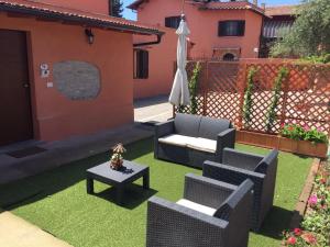 Guests can enjoy amenities such as air conditioning with individual controls in the room, heating facilities and tile flooring throughout the unit. Additional services include express check-in/check-out options, luggage storage access along with private entrance on the ground floor for ease of arrival or departure. Outdoor furniture adorns the terrace where guests relax while enjoying garden views.