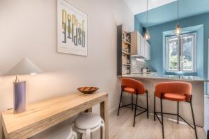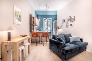 This well-equipped apartment comprises one bedroom with two beds and a living room featuring a sofa bed and seating area. The fully fitted kitchen includes modern amenities such as a stovetop, oven, refrigerator, dishwasher, toaster, coffee machine as well as tea and coffee making facilities accompanied by kitchenware. The bathroom contains both bathtub or shower options along with toiletries including shampoo, conditioner, body soap, it also has a bidet and hairdryer.