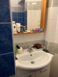 This comfortable apartment includes one bedroom with one bed, complemented by a kitchen equipped with a stovetop, refrigerator, microwave, and full kitchen amenities for convenient self-catering stays. The living area offers a sofa bed and seating area alongside a flat-screen TV for entertainment.