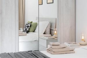Apartament składa się z czterech osobnych sypialni oraz dwóch łazienek wyposażonych w prysznice i bidety. W pełni wyposażony aneks kuchenny zawiera lodówkę, mikrofalówkę, czajnik elektryczny oraz niezbędne przybory kuchenne ułatwiające przygotowywanie posiłków. Dodatkowe udogodnienia obejmują ogrzewanie, klimatyzację, poduszki puchowe i syntetyczne, deskę do prasowania z żelazkiem, pralkę wraz ze stojakiem do suszenia ubrań oraz opcje łóżeczka dziecięcego lub kołyski. Do dyspozycji gości jest także część wypoczynkowa z rozkładaną sofą.